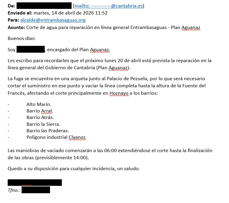 Correo electrónico remitido por el encargado del Plan Aguanaz (Gobierno de Cantabria) el día 14 de abril de 2026, a las 11:52 horas, con toda la información en base a la cual se redactó el aviso de corte de agua previsto para hoy lunes, 20 de abril.