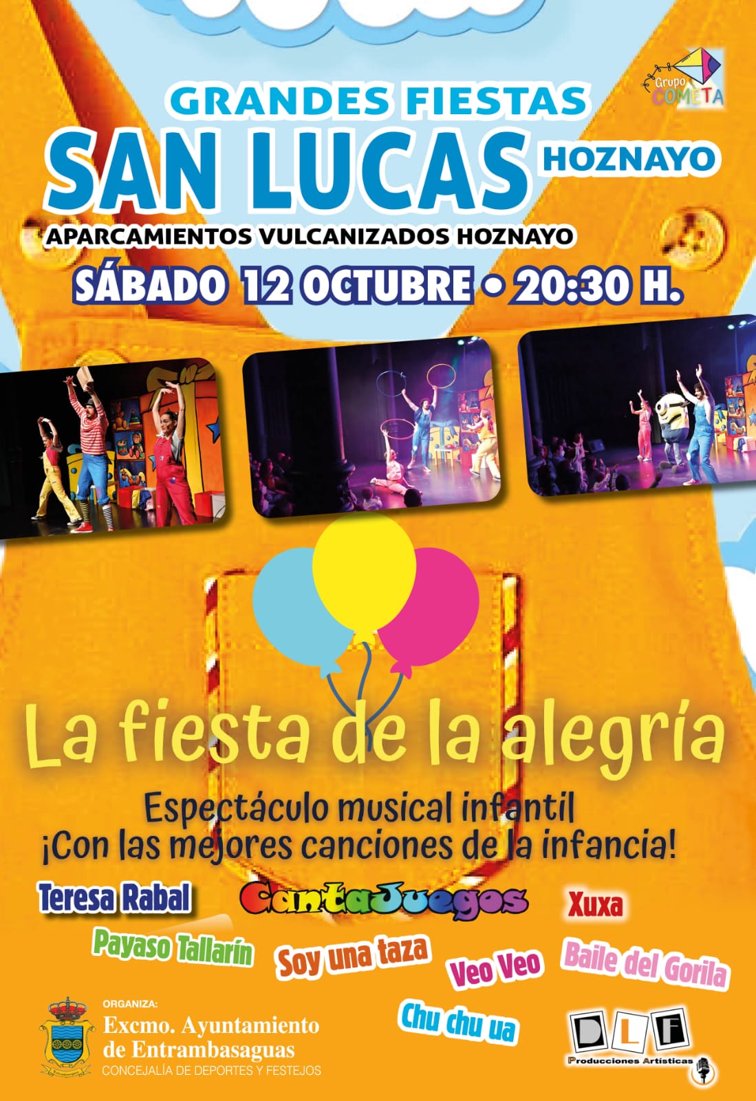 2024-10-12 16:30 h Aparcamientos de Vulcanizados Hoznayo. Espectáculo infantil "La fiesta de la Alegría" Tarde para los pequeños: 16:30 parque infantil y 20:30 espectáculo "La fiesta de la alegría"