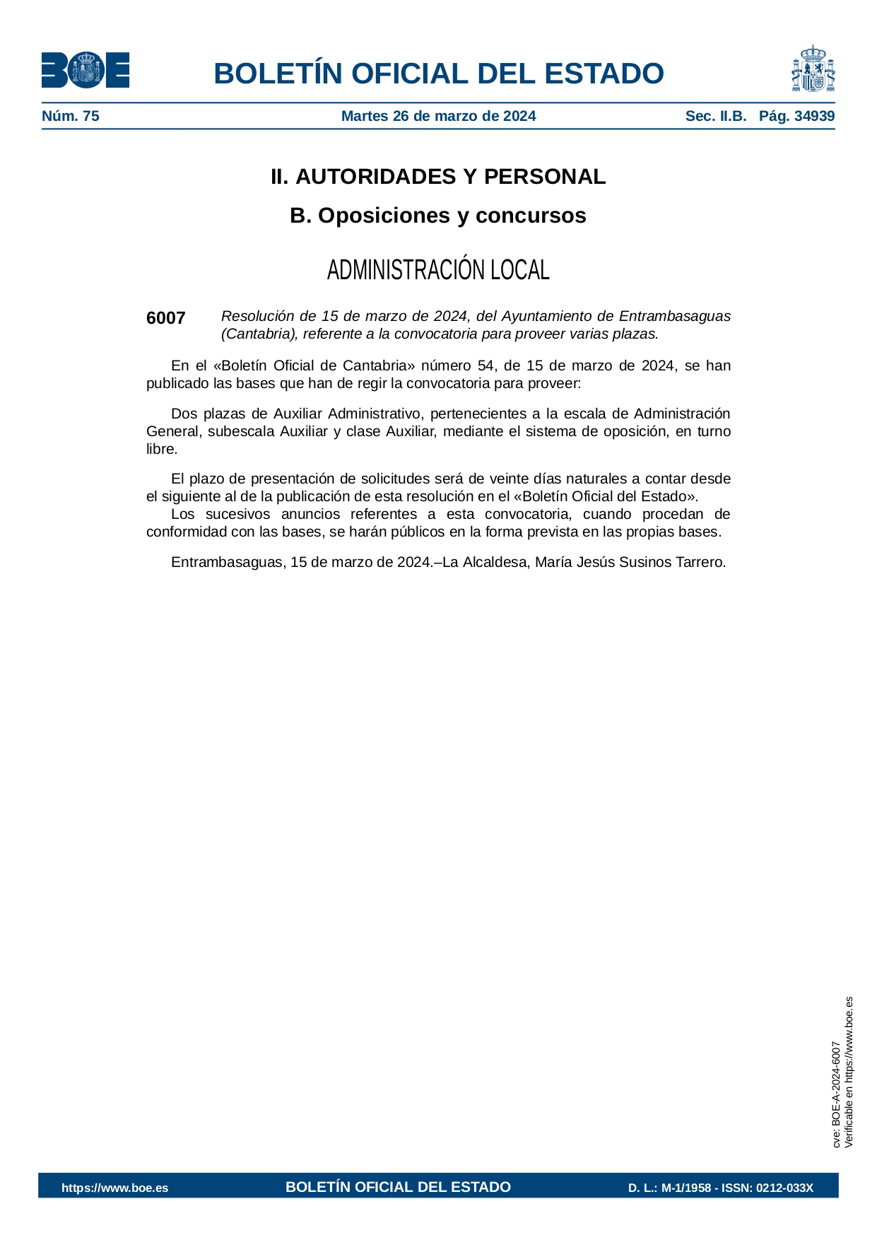 Anuncio del BOE. Procedimiento selectivo convocado para la provisión mediante oposición, de dos plazas de personal funcionario del Ayuntamiento de Entrambasaguas, escala de Administración General, subescala Auxiliar, y constitución de bolsa de trabajo.