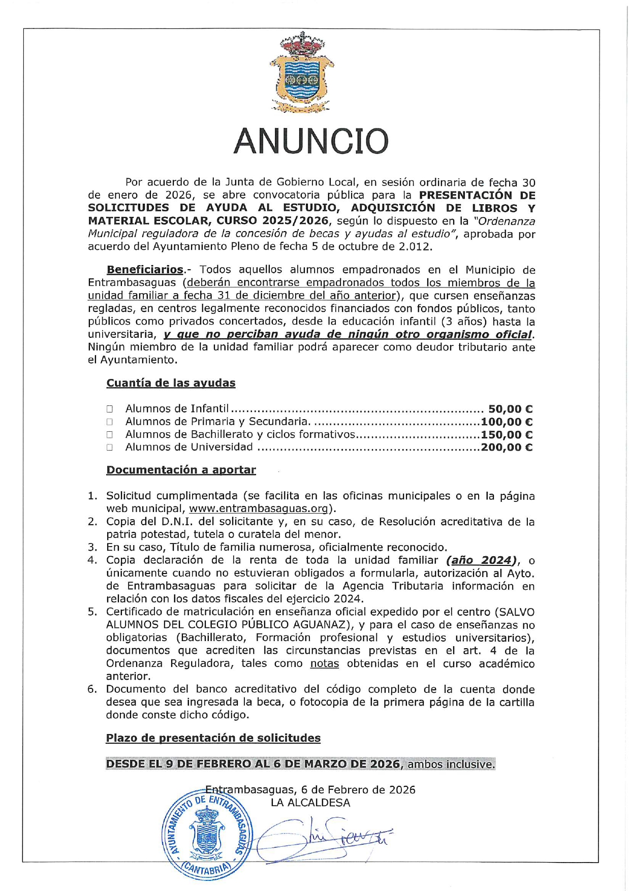 Beneficiarios.- Todos aquellos alumnos empadronados en el Municipio de Entrambasaguas (deberán encontrarse empadronados todos los miembros de la unidad familiar a fecha 31 de diciembre del año anterior), que cursen enseñanzas regladas, en centros legalmente reconocidos financiados con fondos públicos, tanto públicos como privados concertados, desde la educación infantil (3 años) hasta la universitaria, y que no perciban ayuda de ningún otro organismo oficial. Ningún miembro de la unidad familiar podrá aparecer como deudor tributario ante el Ayuntamiento.