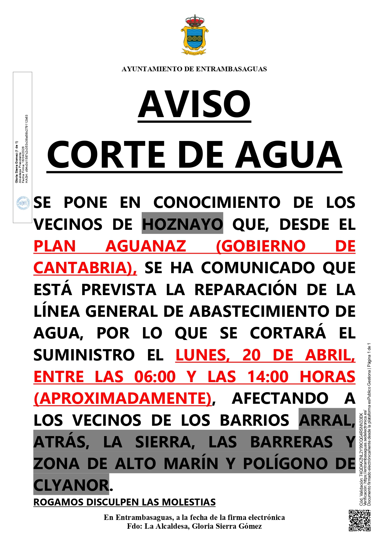 AVISO. Corte de agua en los barrios Arral, Atrás, La Sierra, Las Barreras, zona de Alto Marín y polígono de Clyanor.