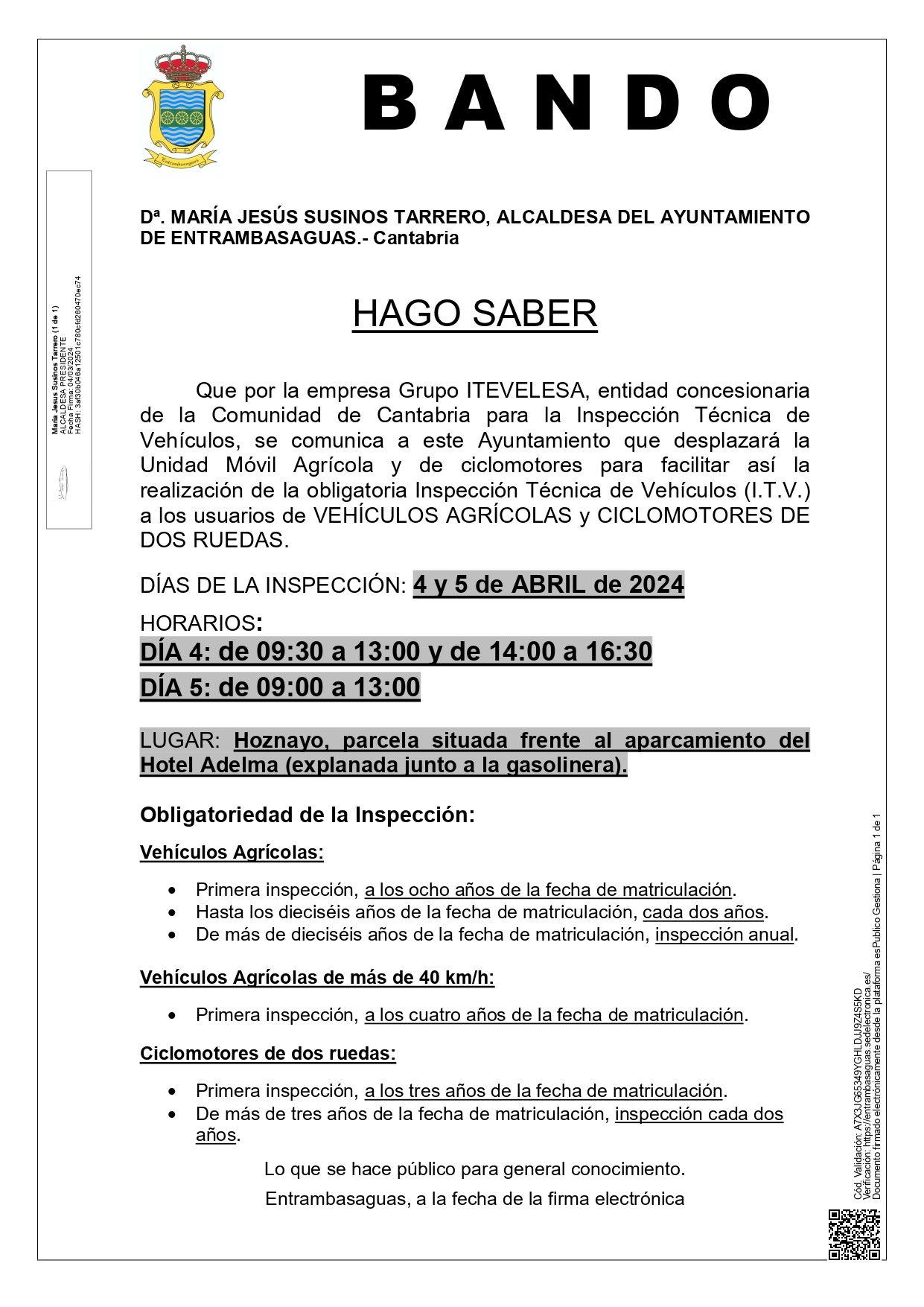 BANDO. Inspección Técnica de Vehículos (I.T.V.) a los usuarios de VEHÍCULOS AGRÍCOLAS y CICLOMOTORES DE DOS RUEDAS.