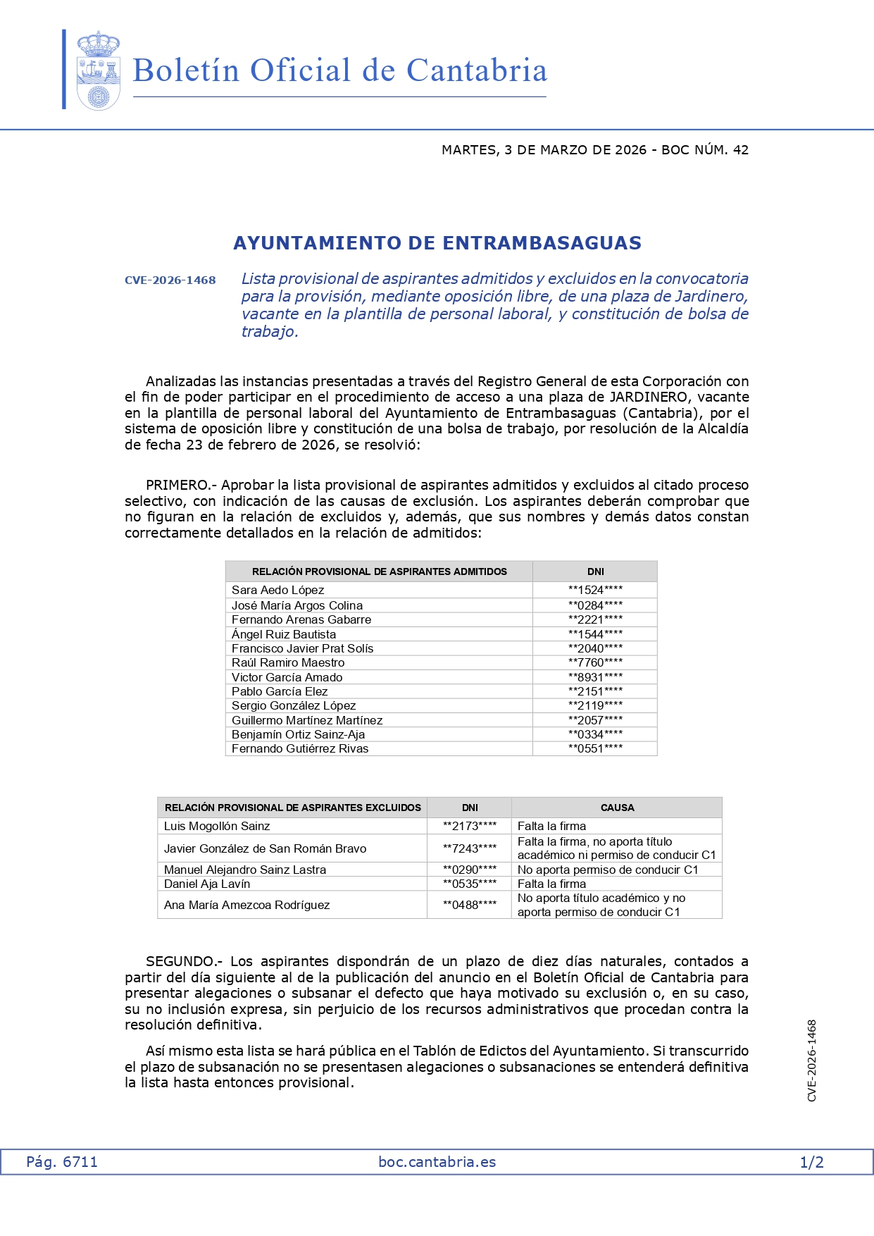 Lista provisional de aspirantes admitidos y excluidos en la convocatoria para la provisión, mediante oposición libre, de una plaza de Jardinero.