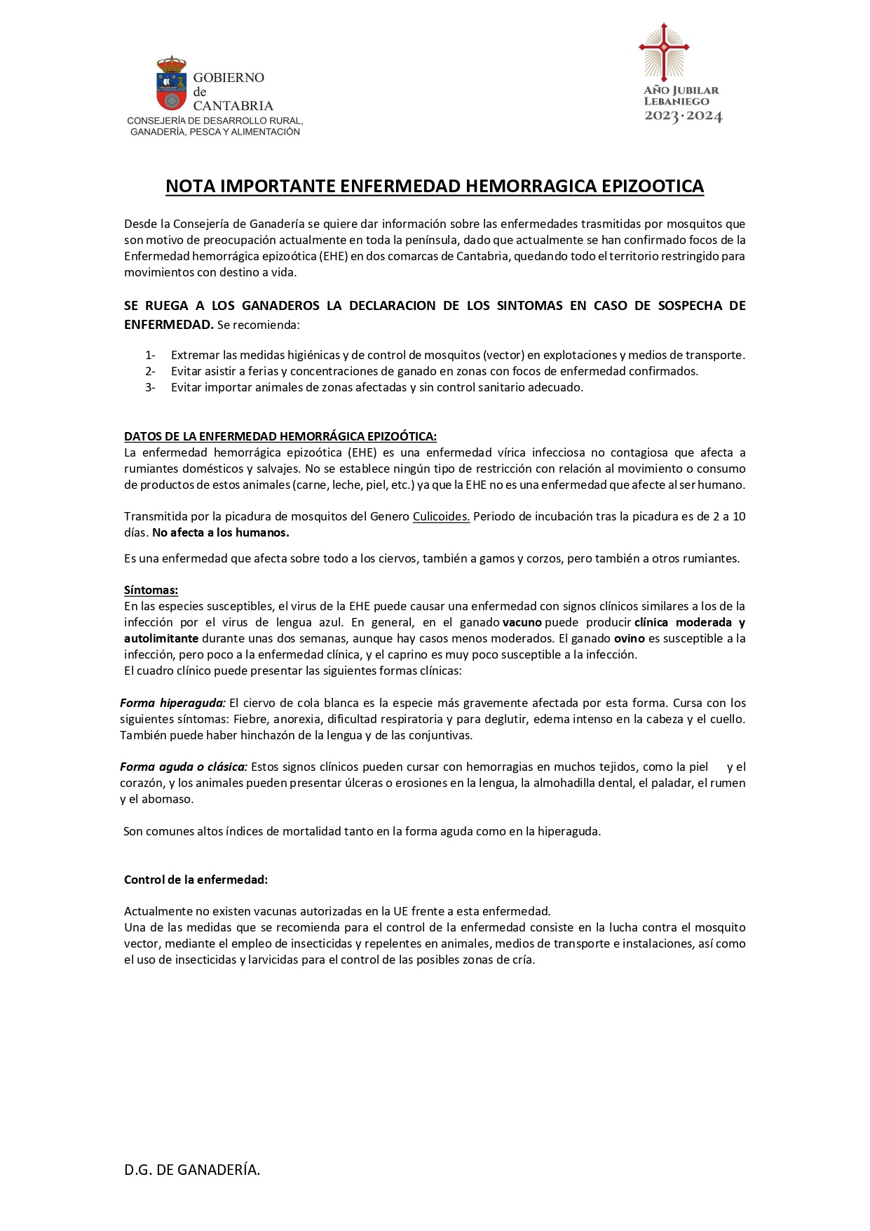 Nota informativa de la Dirección General de Ganadería referente a la situación actual de la enfermedad hemorrágica epizoótica.