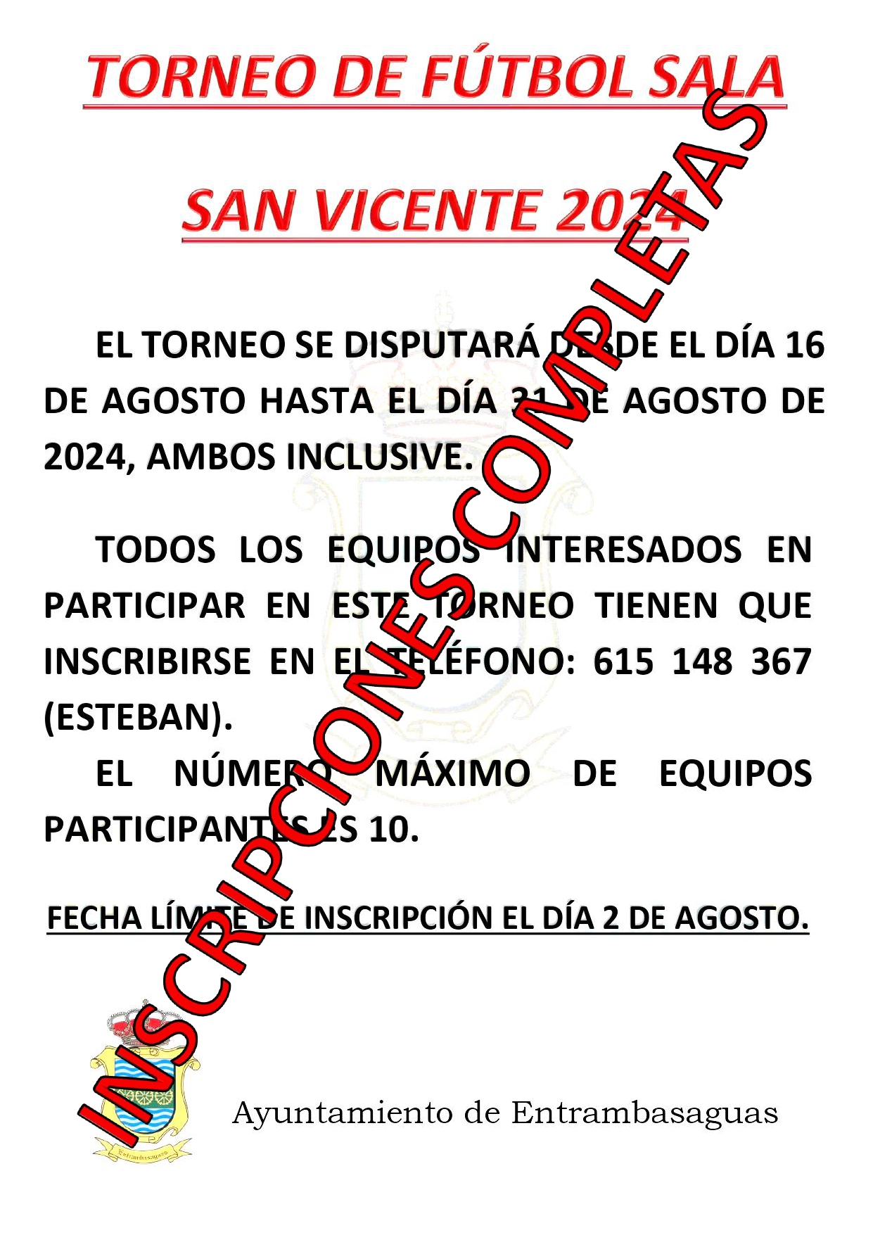 Torneo de Fútbol sala, San Vicente 2024. Inscripciones. / July 10, 2024 Enviado por Oscar el July 10, 2024 ÚLTIMO AVISO: CUPO MÁXIMO DE EQUIPOS ALCANZADO. INSCRIPCIONES COMPLETAS.